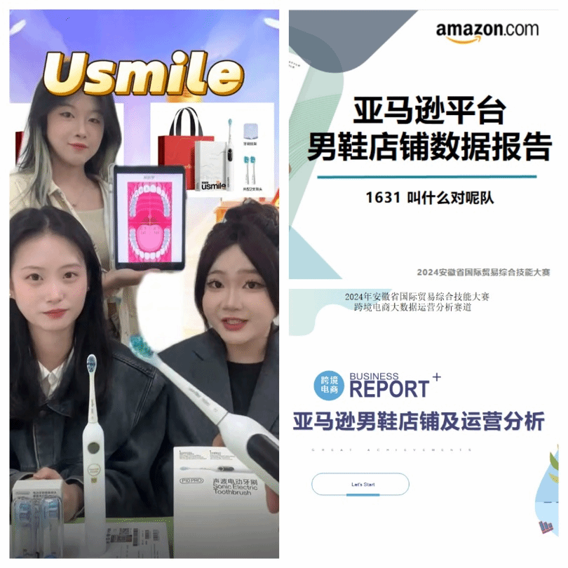 跨境电商网络直播赛道要求采用纯英文进行,从直播产品、编导、主播、运营等直播全流程进行考核。重点考察主播的英语水平、对产品卖点的挖掘、商品特性的展示技巧、直播间前景后景搭建、直播团队的协助能力等。鸭脖官网“重生之成为女主播队”(指导老师:刘伟 黄菁菁)搭建“Usmile电动牙刷”直播间,在该赛道荣获一等奖。
