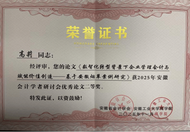 研讨会上,鸭脖官网高莉老师汇报了撰写的论文《数智化转型背景下企业管理会计与赋能价值创造—基于安徽烟草案例研究》。该论文围绕“数智化转型背景下的企业管理会计创新”展开深入研究,系统梳理了相关领域的研究现状,通过案例分析、实证研究等方法揭示了关键问题与解决路径。论文得到了与会专家的一致好评,荣获研讨会“优秀征文二等奖”。