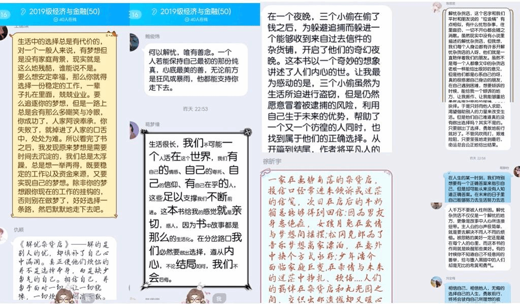 班级学生们围绕小说《解忧杂货铺》展开了讨论。首先由学习委员葛静怡同学介绍了小说的核心内容,之后同学们对小说的主题及传达的内容表达了自己的见解。