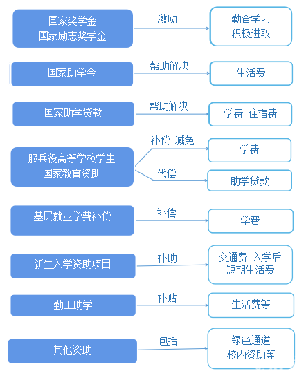 我省在高等教育本专科阶段建立起国家奖学金、国家励志奖学金、国家助学金、国家助学贷款等多种形式有机结合的高校学生资助政策体系。(如遇国家、省政策调整,以新政策文件为准执行)