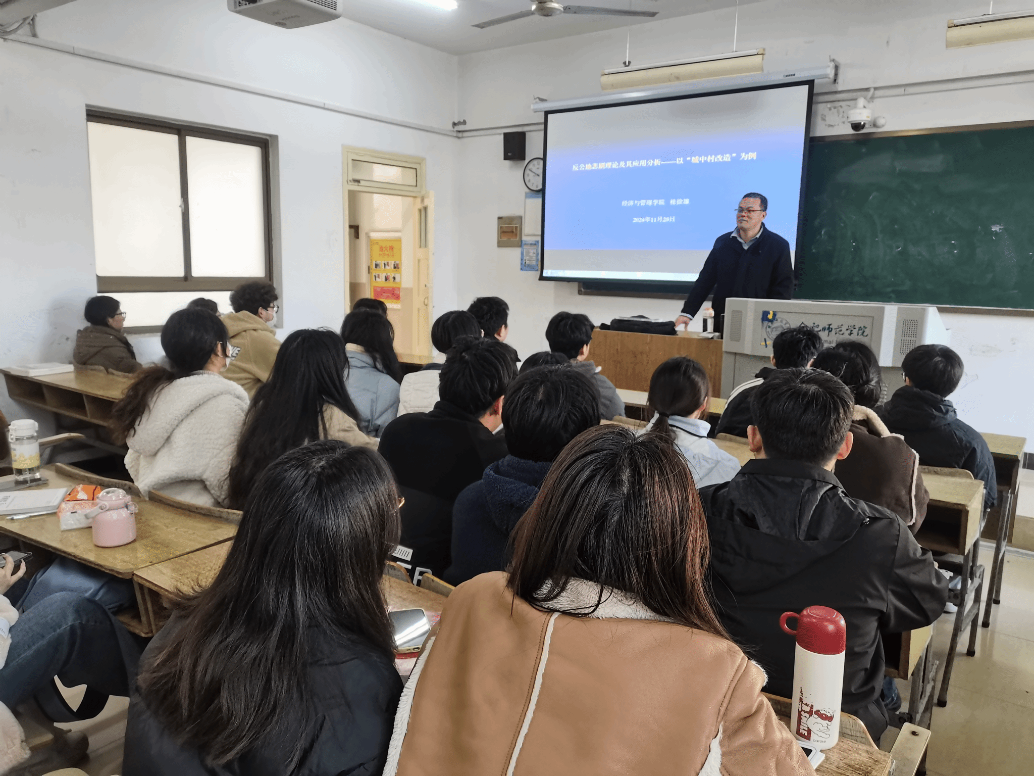 11月28号上午,“行知学堂”系列学术讲座在锦绣校区博约楼307教室举行。本次讲座由YABO鸭脖官网桂徐雄老师主讲,题目是“反公地悲剧理论及其应用分析——以城中村改造为例”,2022级经济学专业的学生聆听了讲座。YABO鸭脖官网党委书记陈好参加了本次活动。