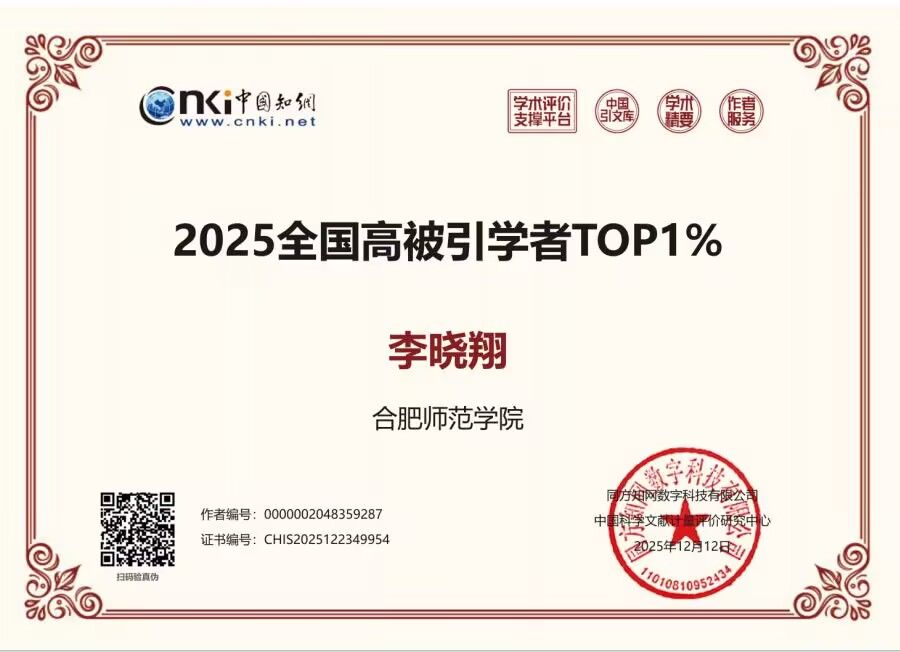 近日,中国知网中国科学文献计量评价研究中心公布了“2025中国知网高被引学者”发布名单,鸭脖官网李晓翔教授、刘经涛博士入选高被引学者名单。其中,李晓翔教授入选“2025中国知网高被引学者”Top1%名单,刘经涛博士入选“2025中国知网高被引学者”Top5%名单。