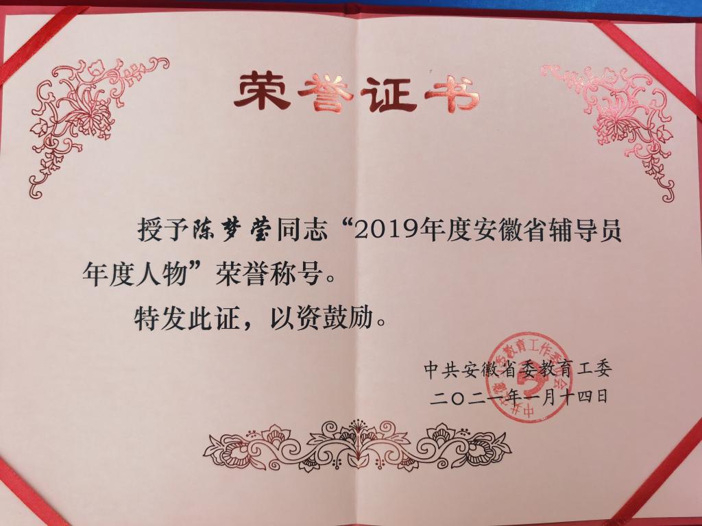 近日,安徽省委教育工委下发《中共安徽省委教育工委关于公布2019年度全省高校辅导员年度人物和优秀辅导员评选结果及2019年度安徽省大学生年度人物评选结果的通知》(皖教工委函〔2021〕13号),鸭脖官网辅导员陈梦莹获得“2019年度全省高校辅导员年度人物”荣誉称号。