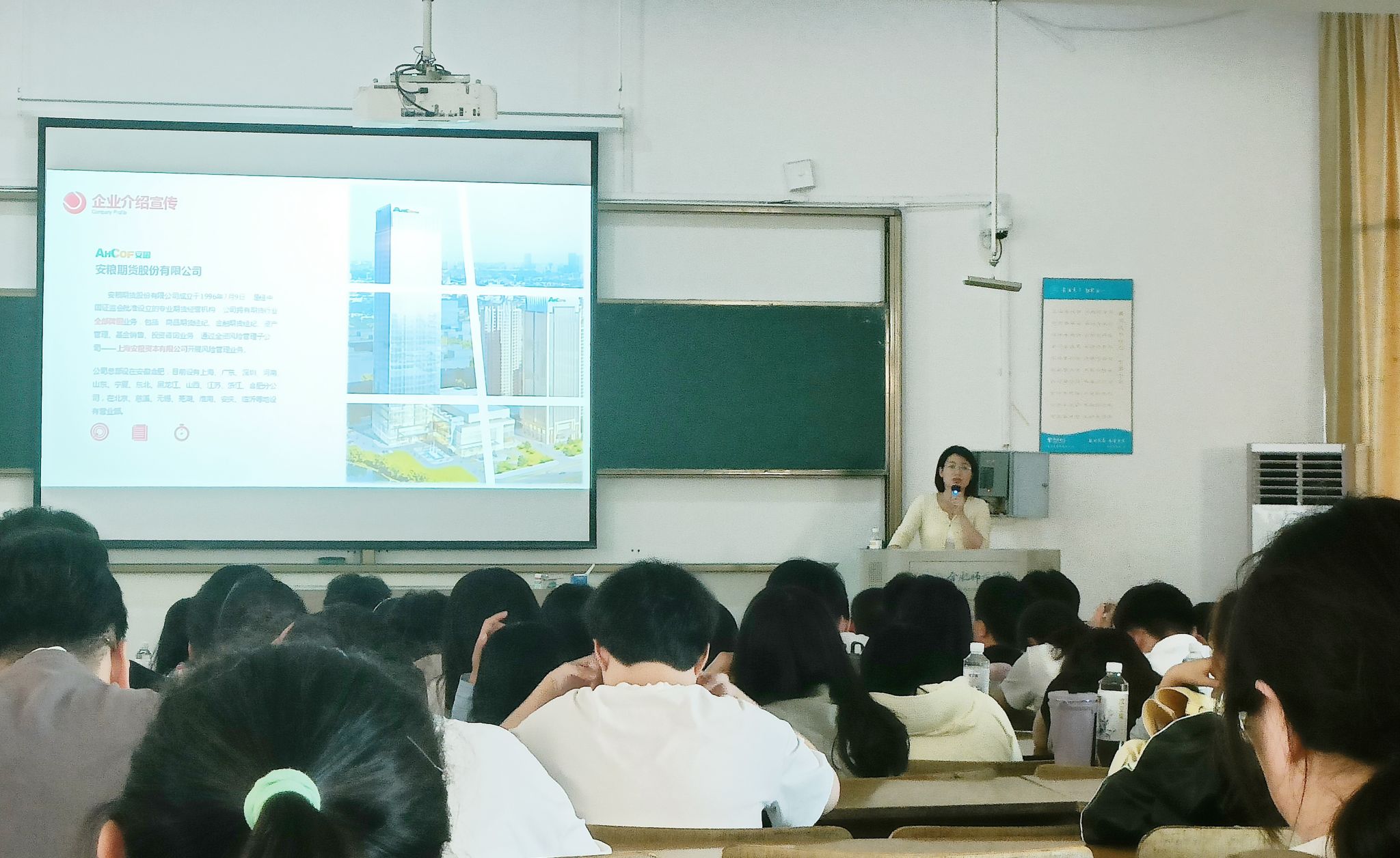 为践行立德树人根本任务,加强校企合作育人,增强学生运用所学理论知识解决实际问题的能力,为后续实习就业奠定基础。6月12日,经管学院在锦绣校区博约楼108教室举办安粮期货合肥分公司期货知识进校园活动讲座。经管学院党委陈好书记,杨德草老师,辅导员曹国志老师与来自2021级经济学、互联网金融、经济与金融、国际经济与贸易四个专业共计140多名学生一同参与本次活动。