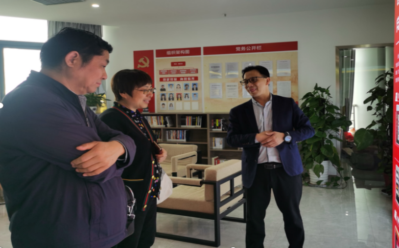 慕晨国际电子商务有限公司总经理唐文生对沈辉一行表示热烈的欢迎,带领参观了企业产品展示厅、企业办公区和党建活动室。