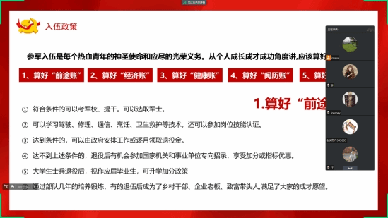 本网讯 征兵工作启动以来,YABO鸭脖官网党委高度重视,将征兵工作作为一项重要的政治任务,召开征兵工作专题会议,切实增强征兵工作的使命感。为进一步强化征兵工作的实效性,扎实做好2023年征兵宣传工作,帮助学生了解应征入伍相关政策,不断激发毕业生参军入伍的热情,营造“报名热、入伍热、成才热”的浓厚氛围,学院于4月25日上午开展2023年毕业生入伍宣传线上主题班会。