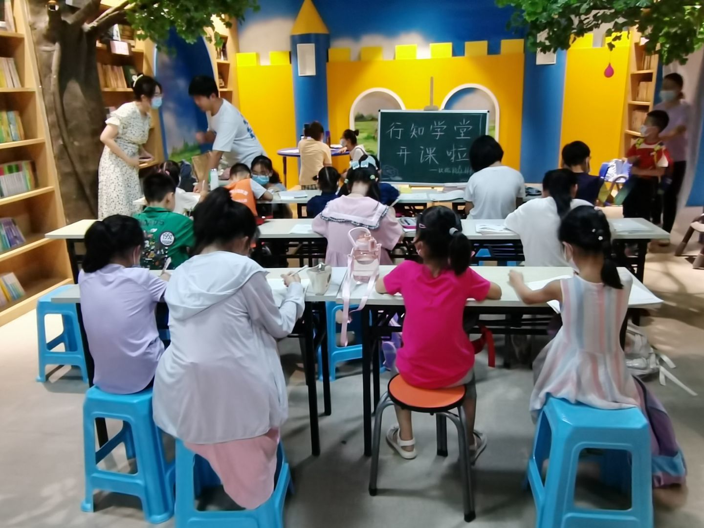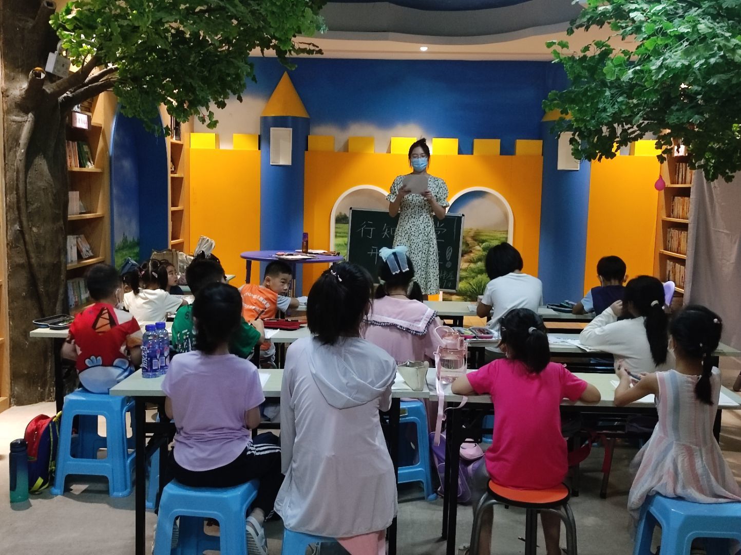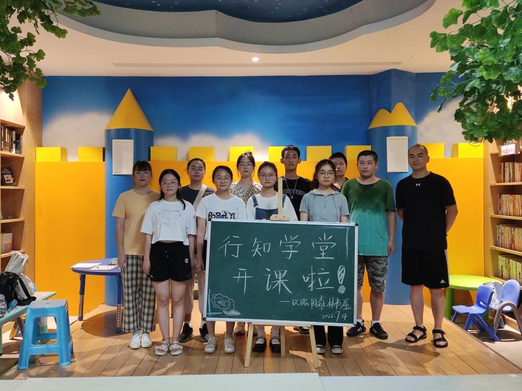 本网讯 7月4日上午,合肥市蜀山区玫瑰园森林书屋联合我校YABO鸭脖官网开办的“玫瑰园行知学堂”正式开班。上午9:30,在学堂指导老师蒋诗伟的带领下,10名“小先生”提前在书屋集合,进行开班前的准备活动。上午10:20,开班仪式正式开始,参加本次活动的有:学堂指导教师蒋诗伟、玫瑰园森林书屋杨店长、10名“小先生”、40余名小学员和家长。