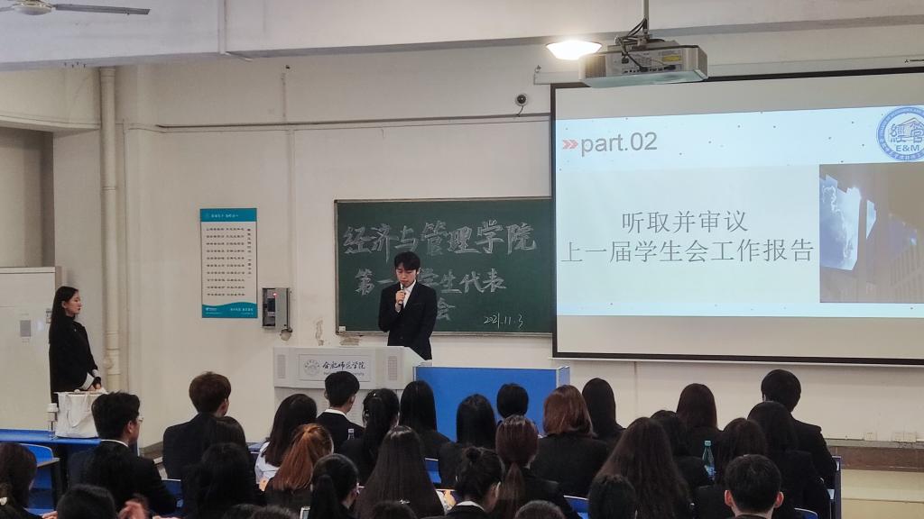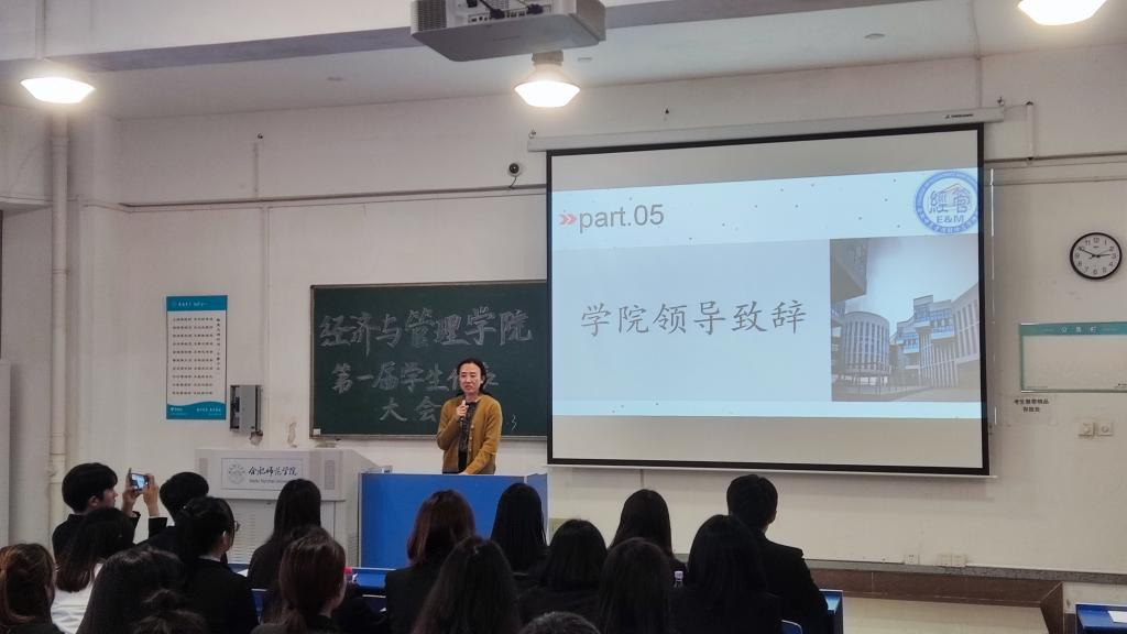 本网讯11月3日,YABO鸭脖官网第一次学生代表大会在锦绣校区逸夫楼109教室组织召开。YABO鸭脖官网党委副书记陶敏老师应邀出席,分团委书记赵燕、学院各年级团干、普通学生共九十名齐聚一堂,共同谋划全院学生自身发展的大事。