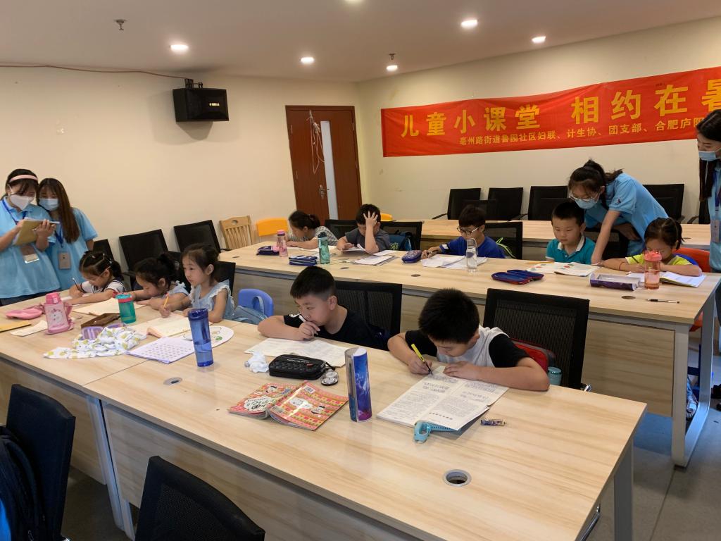 本网讯2021年7月29日上午,由我校YABO鸭脖官网、马克思主义学院、外国语学院组成的8名志愿者们来到了安徽省合肥市庐阳区鲁园社区,并且携手社区主任一同开展了行知学堂开班仪式。由于台风“烟花”的影响,此次学堂推迟了3天,可谓称得上是好事多磨。这是我校YABO鸭脖官网与鲁园社区的第三次合作,双方致力于为小学员们营造一个安静、充实的学习环境。