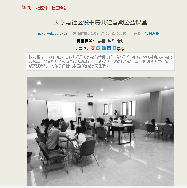 7月13日,合肥晚报、合肥在线报道鸭脖官网海恒社区行知学堂志愿服务活动。(YABO鸭脖官网)