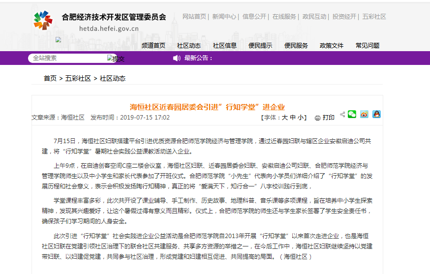 7月15日,合肥经济技术开发区管委会官方网站报道鸭脖官网清华启迪科技园“行知学堂”实践活动。(YABO鸭脖官网)